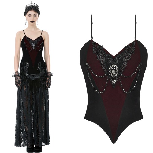 Elevate your gothic style with the Angelina Red and Black Gothic Velvet Corset Top. Featuring velvet fabric, embroidery lace, beaded strings, and a sparkly brooch motif, this corset-style top is perfect for gothic weddings, cosplay, or alternative evening wear.