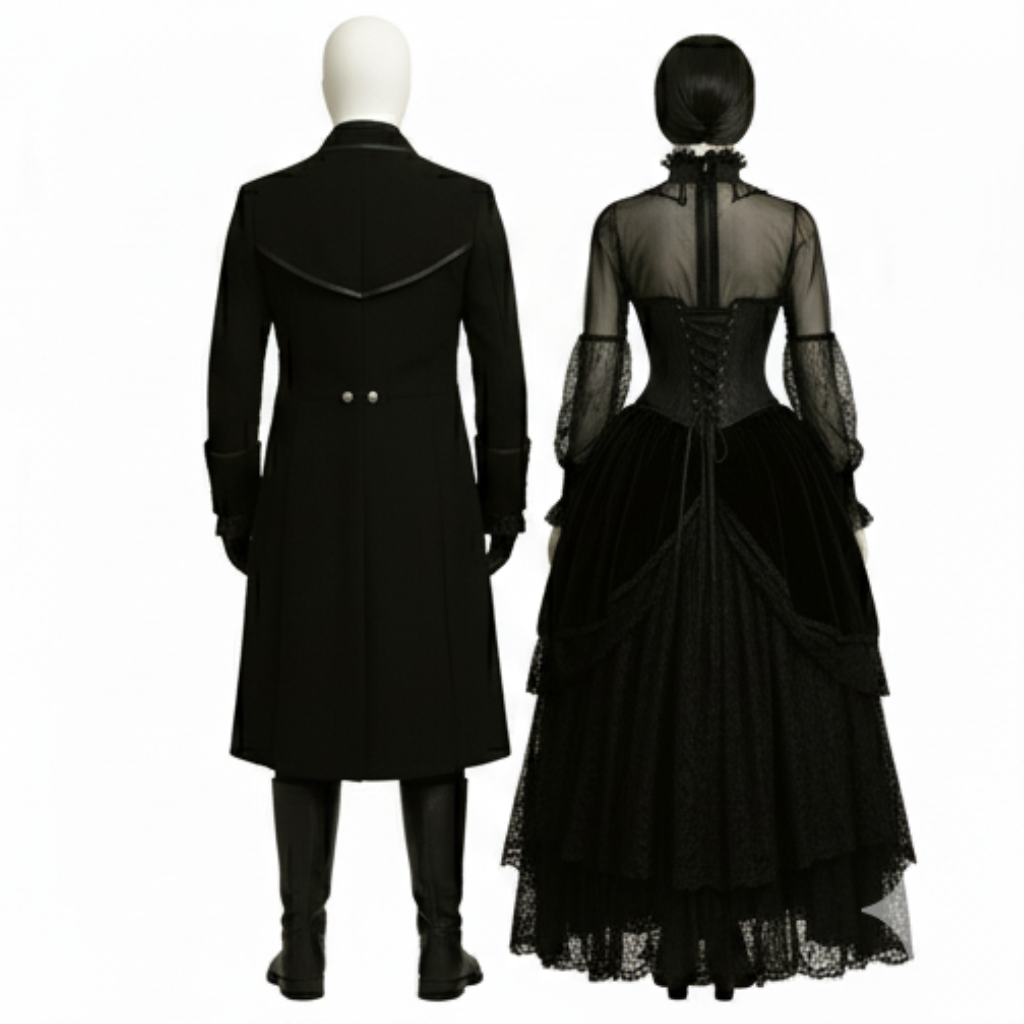 Step into the timeless allure of dark romance and vintage elegance with the Unisex Black Victorian Gothic Vampire Couple Set. Designed for lovers of gothic fashion, this handcrafted ensemble captures the essence of Victorian sophistication, steampunk flair, and vampire mystery — perfect for couples who crave bold, theatrical style.