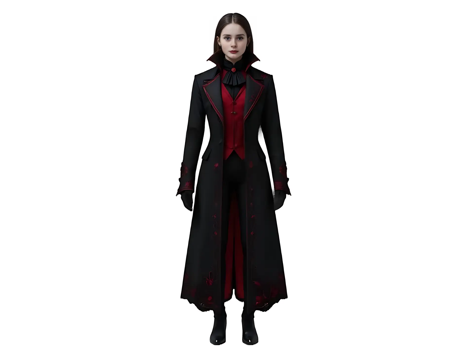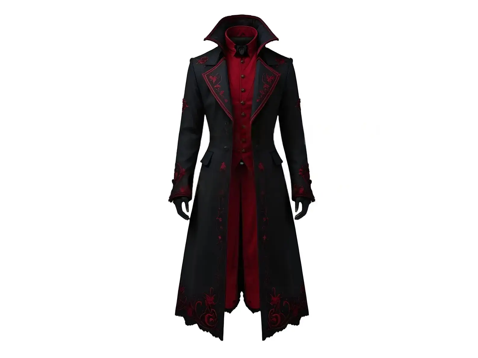 Handcrafted from 100% premium cotton with rich red embroidery and black detailing, it features a high vampire collar, double-breasted decorative button closure, and long trench-style silhouette for an authentic gothic aesthetic. The luxurious red satin lining and embroidered accents at cuffs and hemline elevate this piece beyond ordinary outerwear, making it the ultimate choice for gothic festivals, vampire cosplay, and theatrical events.