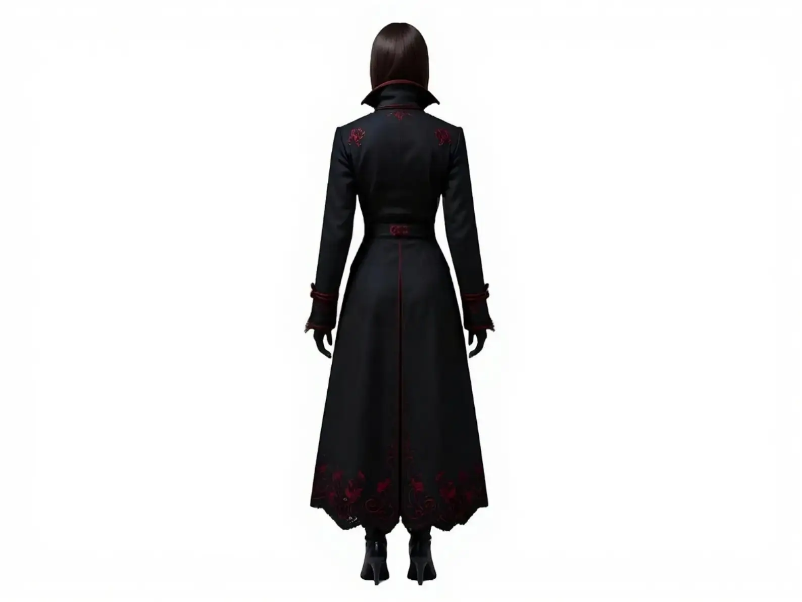 - Long trench coat style with tailored Victorian silhouette