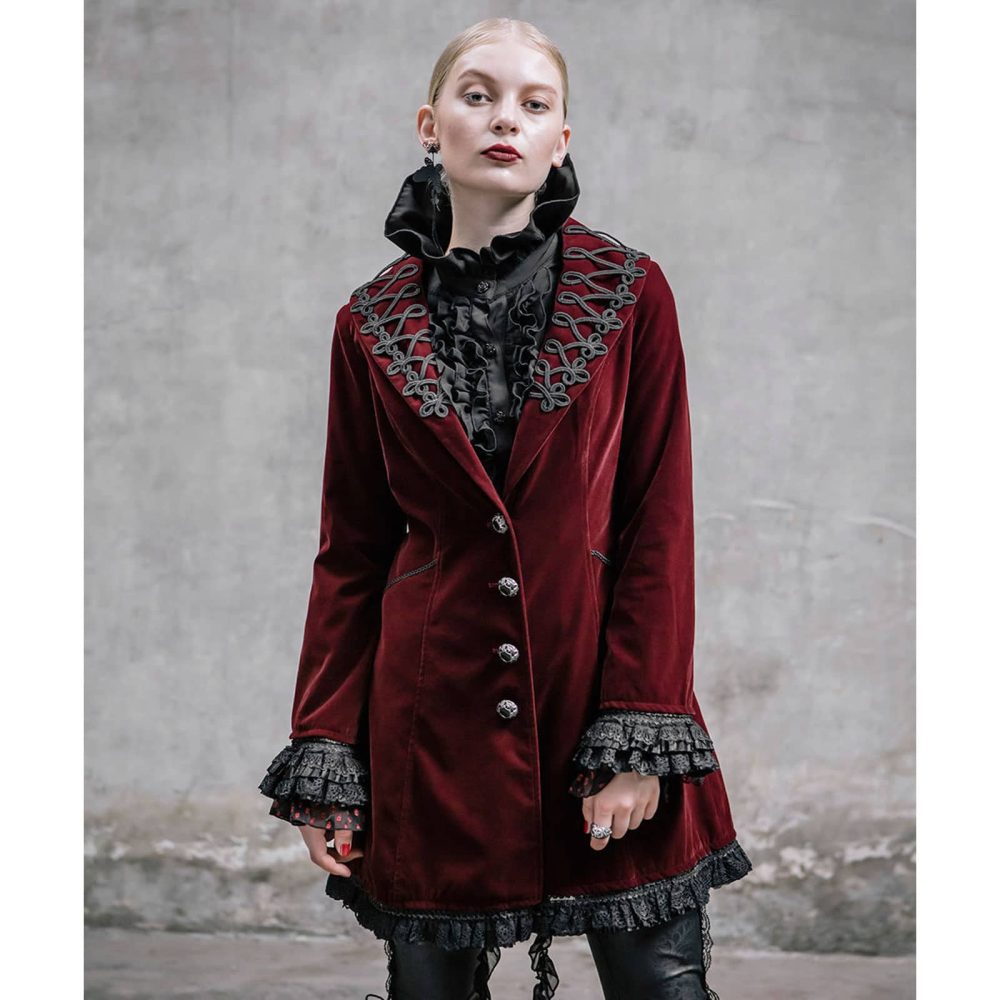 Women Red Rose Velvet Gothic Victorian Steampunk Frock Coat – Handmade Luxury Gothic Elegance