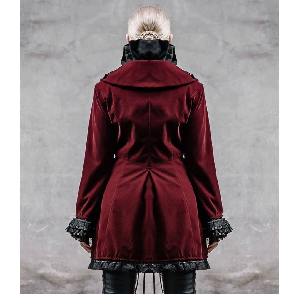 The front is tailored with super-soft red velvet polyester fabric, giving the coat a luxurious texture and striking visual depth. The unique collar design can be worn folded down for a classic Victorian look or turned up for a more mysterious steampunk flair.